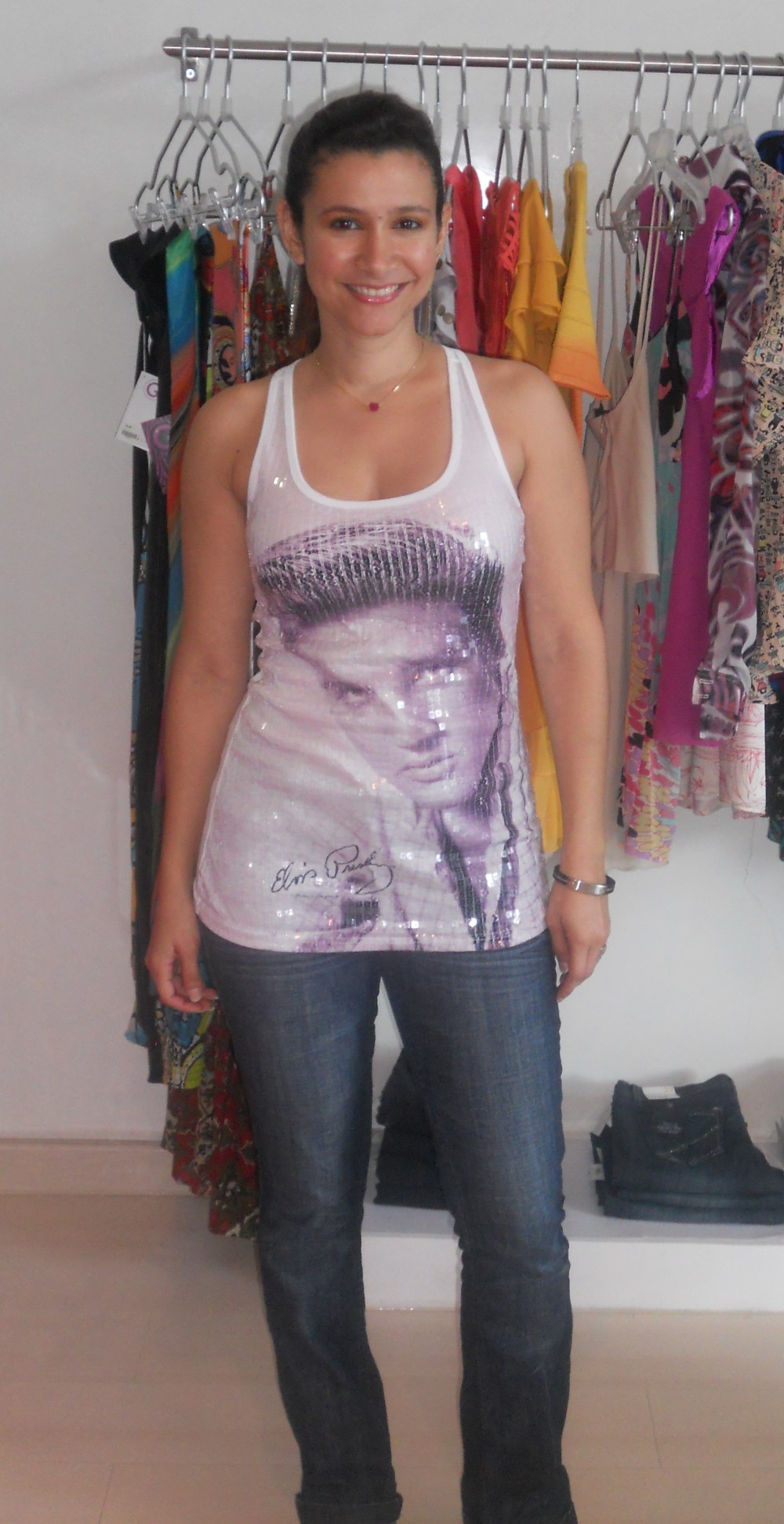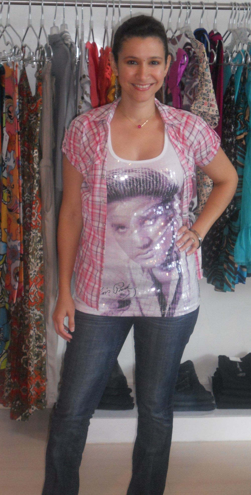 Hoy me probé mi franela de Elvis que la había dejado guardada desde noviembre porque sentía me ajustaba demasiado. Como me quedó bien, quería de todas formas ponérmela y lo intenté con sacos y abrigos, pero la que más me gustó fue esta camisa de cuadros, tipo vaquera.