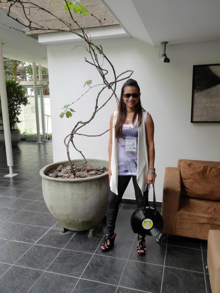 El segundo día lo dedicamos al pabellón de conocimiento, adonde aprovechamos las charlas que dieron. Preferí un skinny rojo con top de rosas rosadas, rojas y cremas en fondo negro y saco de suede crema. Cartera naranja. Collar de perlas negras.