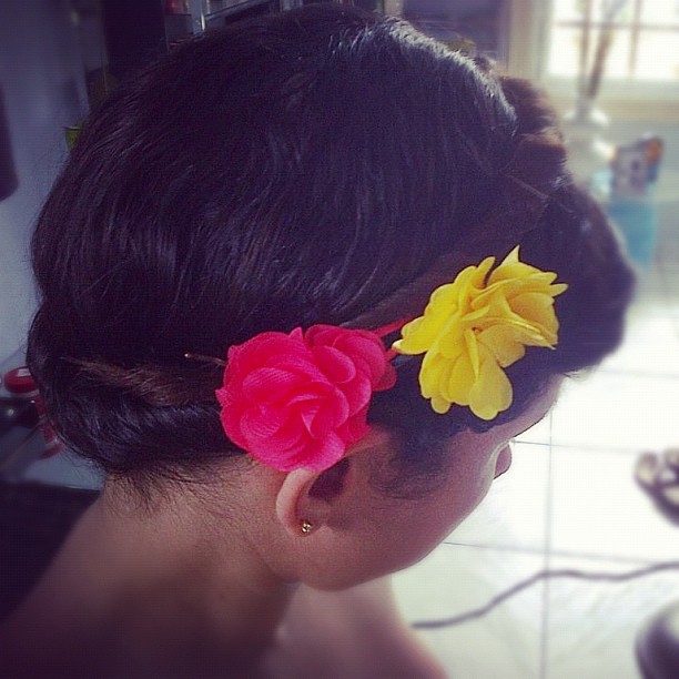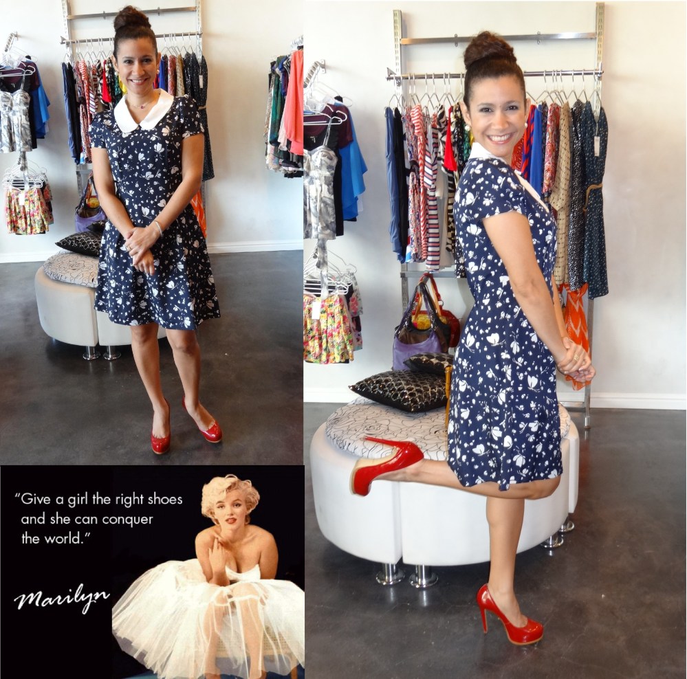 Vestido de fondo azul con print de mariposas blancas con cuello Peter Pan (me desayuno el nombre, gracias a mi hermanita siempre ilustrándome). Los zapatos hermosos en rojo charol. Peinado super fácil, pero llamativo de moño alto. Aretes de perlas XL.