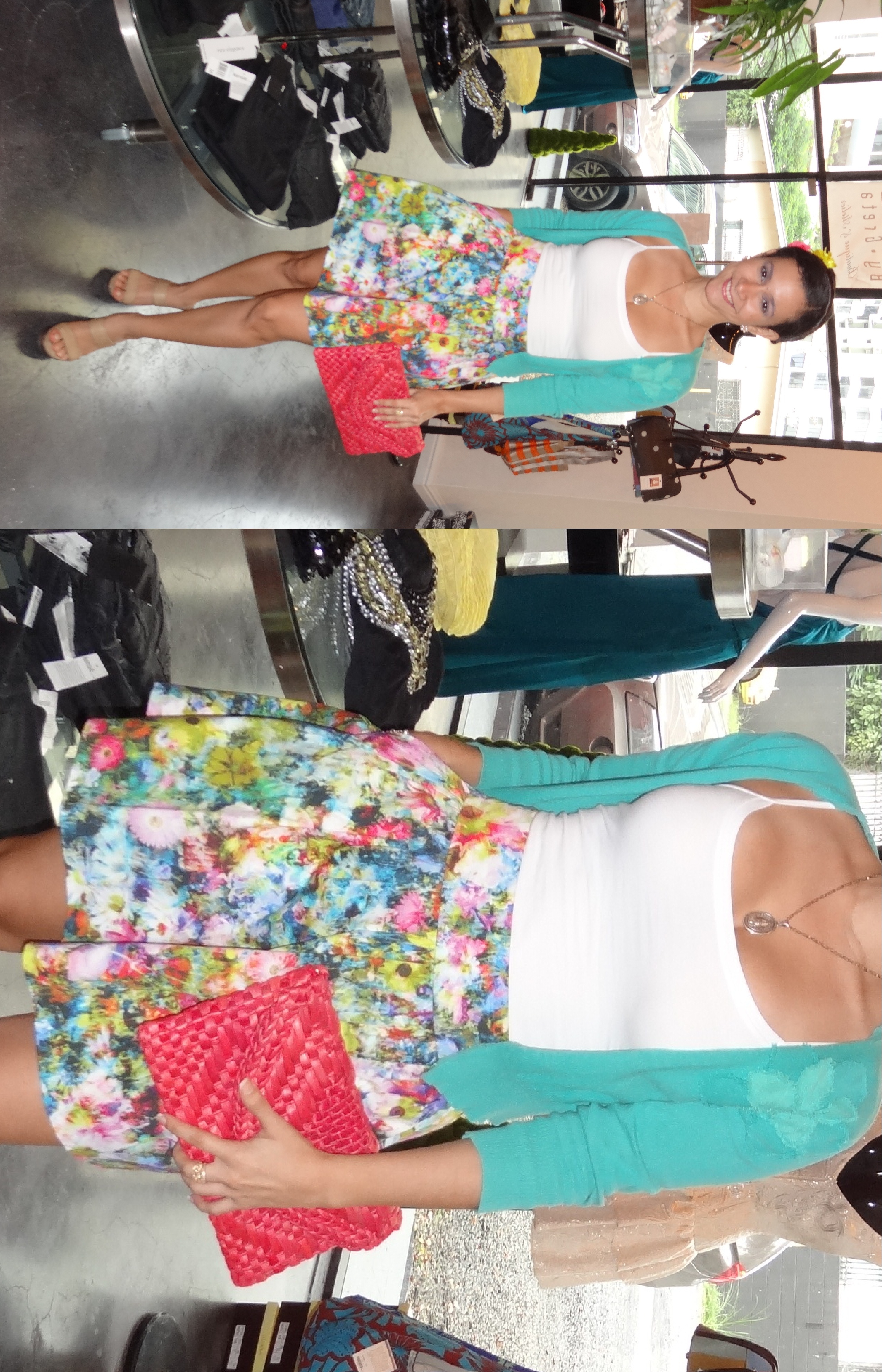 Falda ancha de flores con top básico blanco y cardigan verde. Zapatos de cuña (hoy necesitaba algo cómodo, tengo secuelas de los de ayer) . El peinado todo recogido con detalles de flores de colores que combinan con la falda. La cartera tipo sobre de raffia coral.