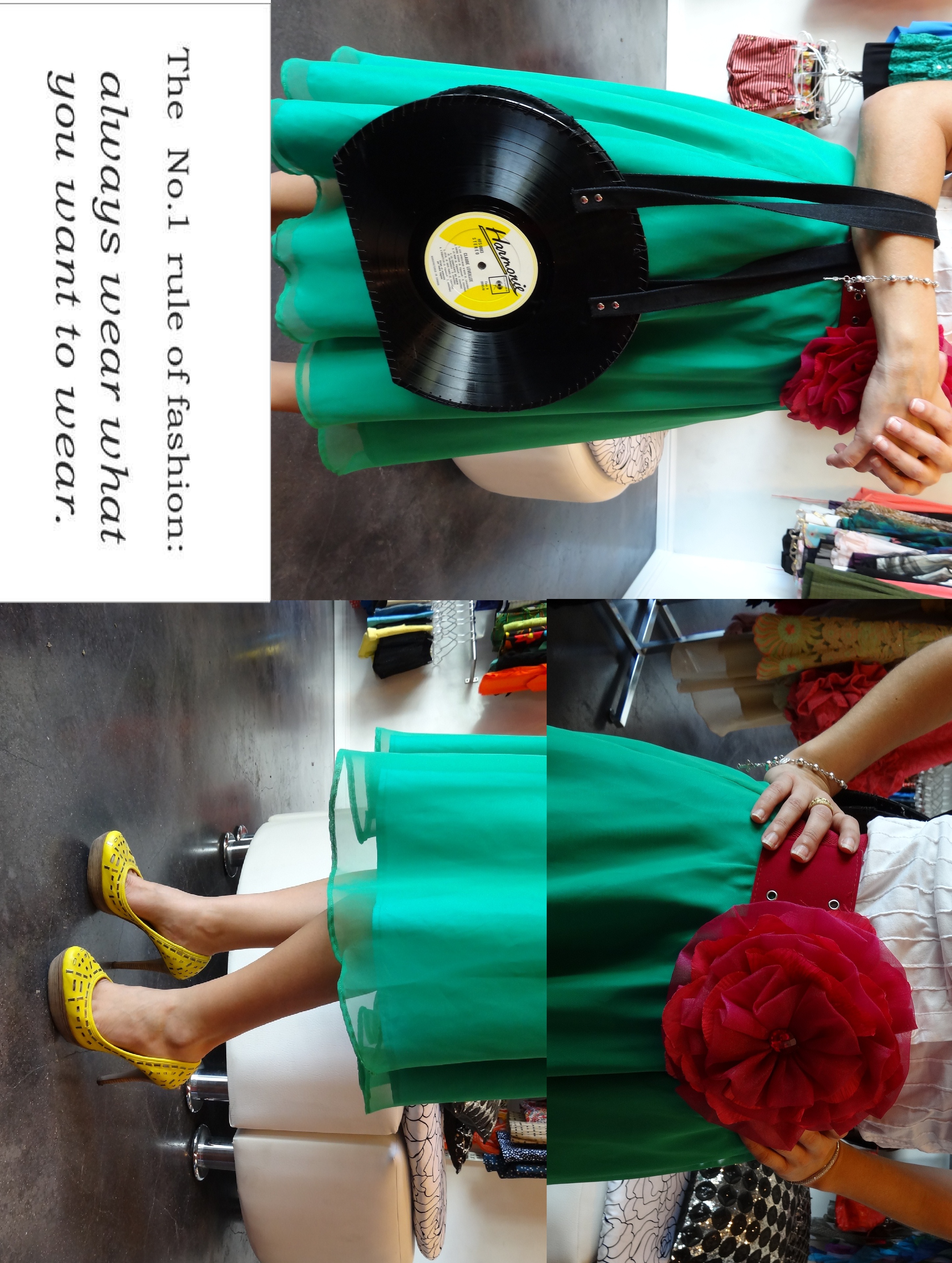 Me divertí seleccionando este atuendo. La camisa blanca básica (no es suficiente tener solo 1), la falda es vintage , la cartera de discos LP reutilizados (la compré en la Feria Yo Reciclo http://robamorena.com/feria-yo-reciclo/ ) , pumps amarillos y la correa de mis preferidas para darle un toque llamativo a cualquier outfit.