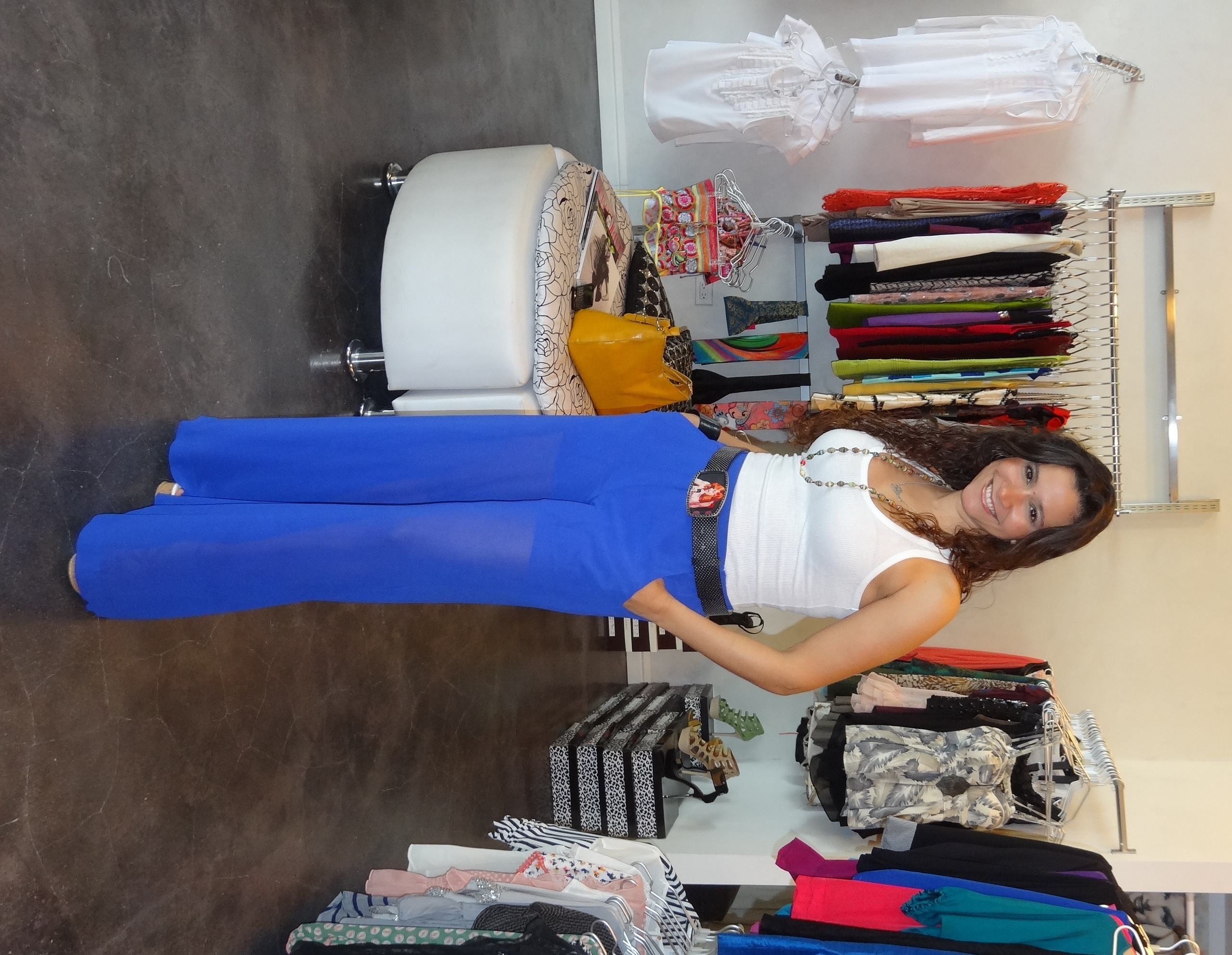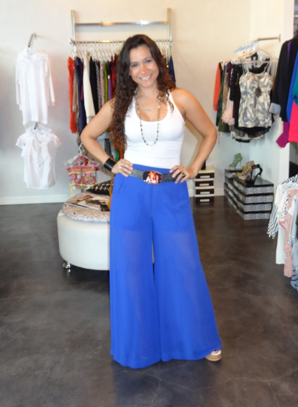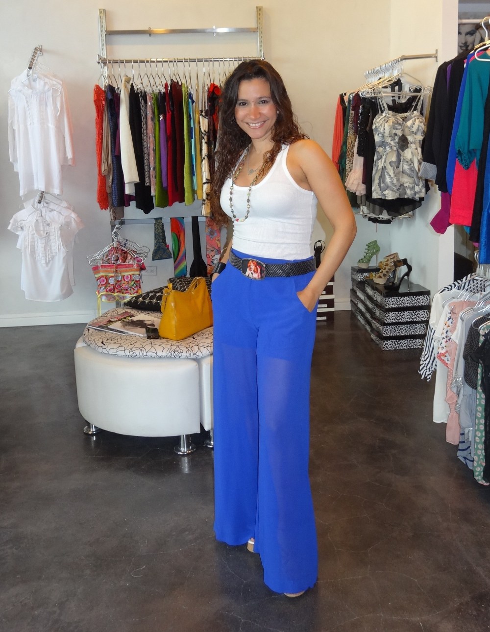 Franela blanca con palazzo de chiffon azul. La correa de Madonna (1 de mis mamis). Collar con mi nombre en plata y el otro es de papel reciclado ( siempre que voy a la Feria Yo Reciclo encuentro bellezas y rarezas). Pulsera de cuff de discos LP y mi cartera utility amarillo mostaza que me combina y contrasta con todo.