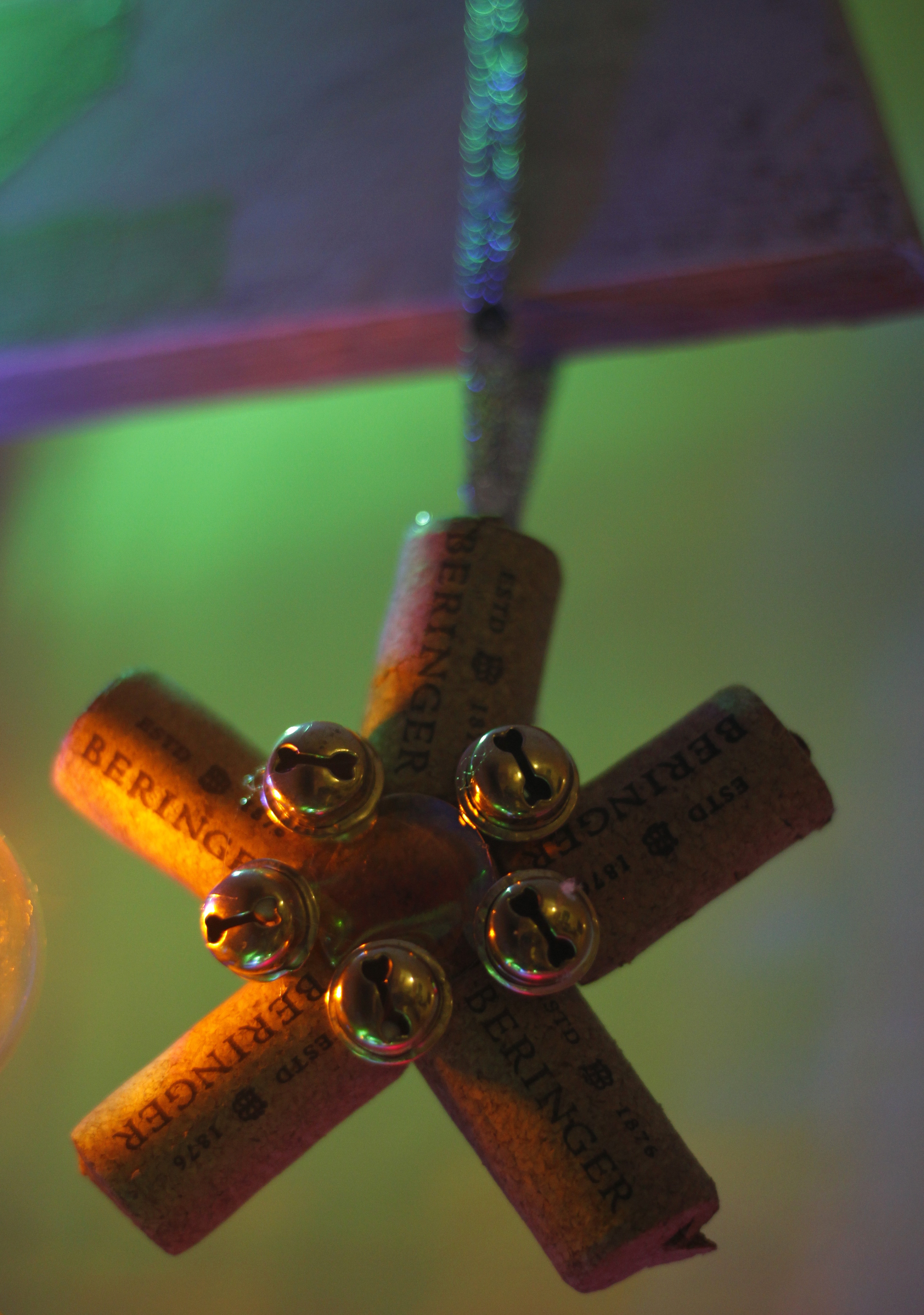 Detalle de estrella con corchos, cinta y cascabeles.