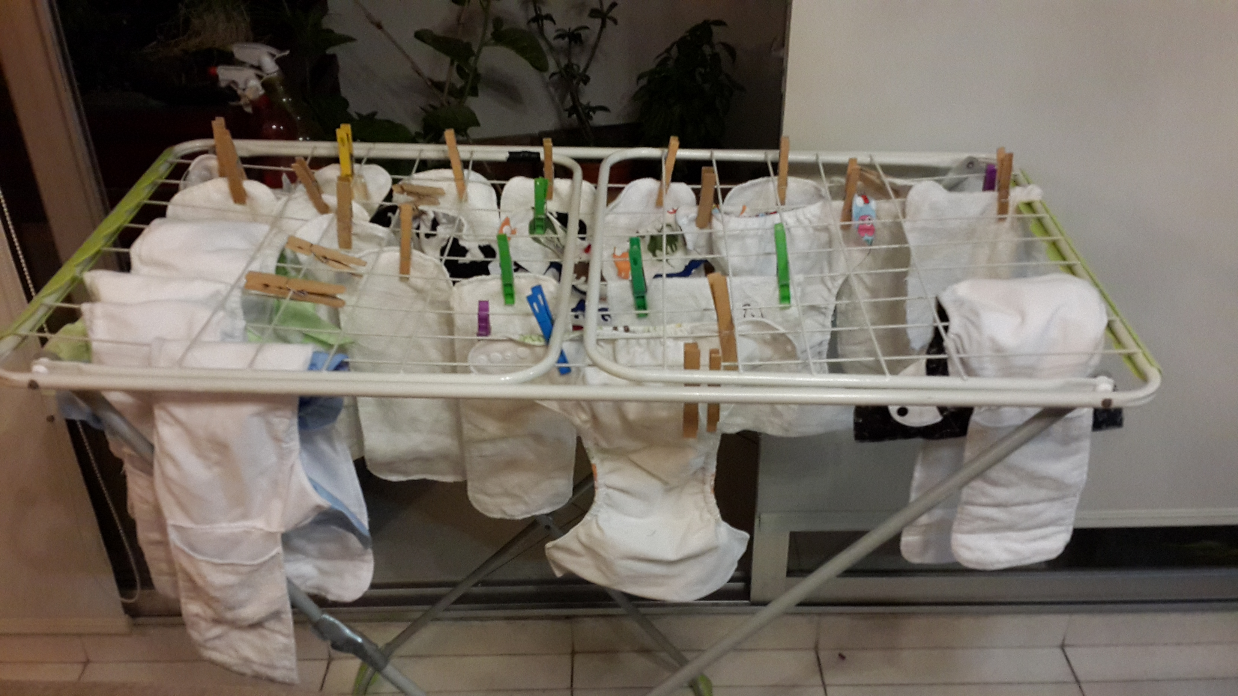 Es una inversión que se hace al principio y ya después nos despreocupamos de estar comprando a cada rato pañales..  Cada 2 ó 3 días, los enjuago, meto en la lavadora con una medida de jabón TIDE, unas gotas de aceite TEA TREE  y un poco de vinagre blanco, no se puede ser «pilinqui» (agregar poco) con el jabón .  Se secan súper rápido . Pueden meterse a la secadora o secarlos al aire libre en el tendedero. Yo siempre los guindo adentro del apartamento en la noche y al día siguiente ya secos.  Es aún más rápido cuando los saco al balcón.