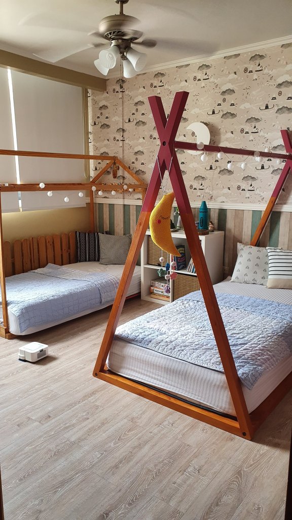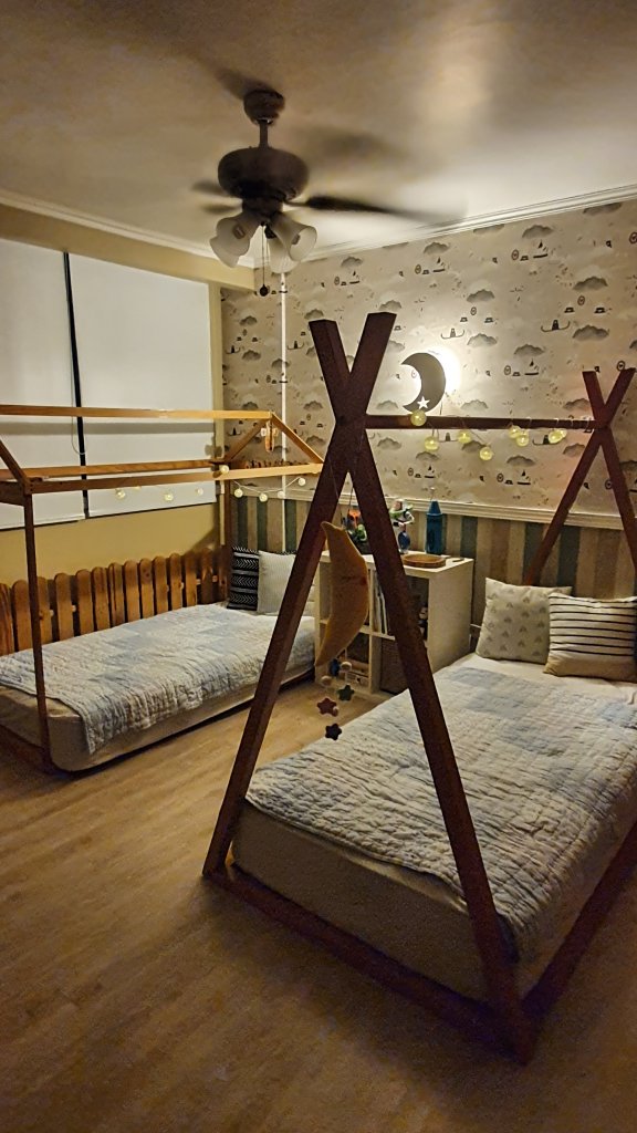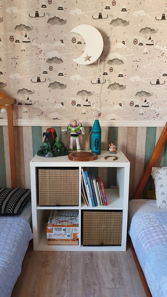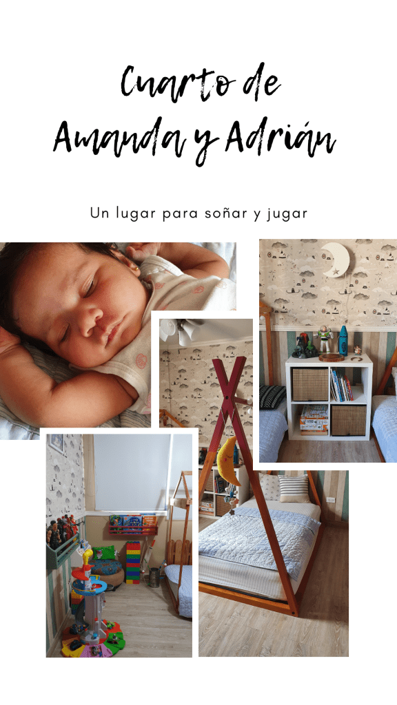 El cuarto lo adecuamos para que lo compartieran los 2. María Cristina de EffectoLab me dio sugerencias de proveedores y encontramos este mix de papeles que combinaron divino. Adrián dio el visto bueno. La idea inicial era una pared de un papel con colores de niño y el mismo diseño con colores de niña, PERO, este nos pareció lindo y nos decidimos por estos. Además la cama de Amanda será como un teepee.