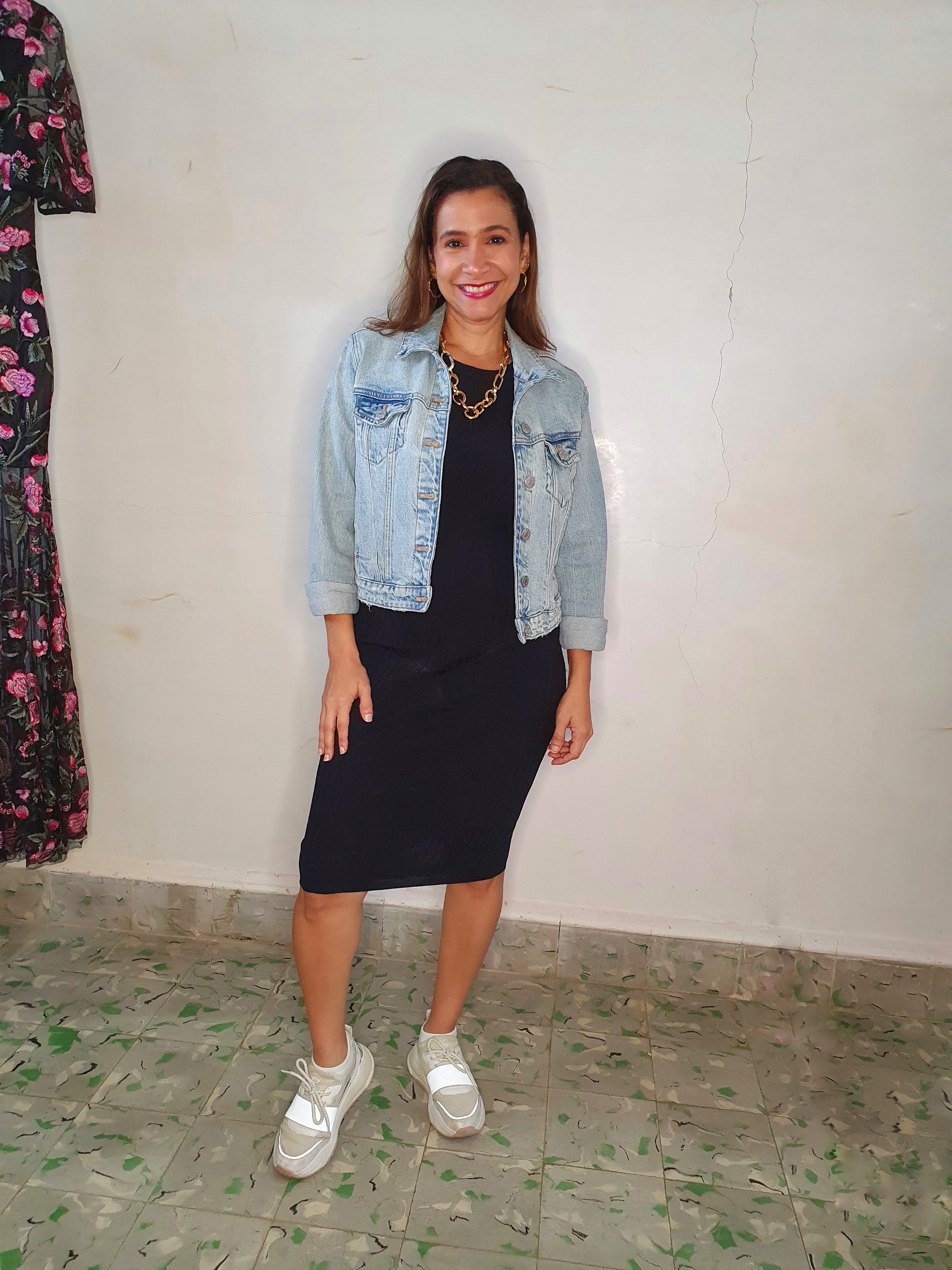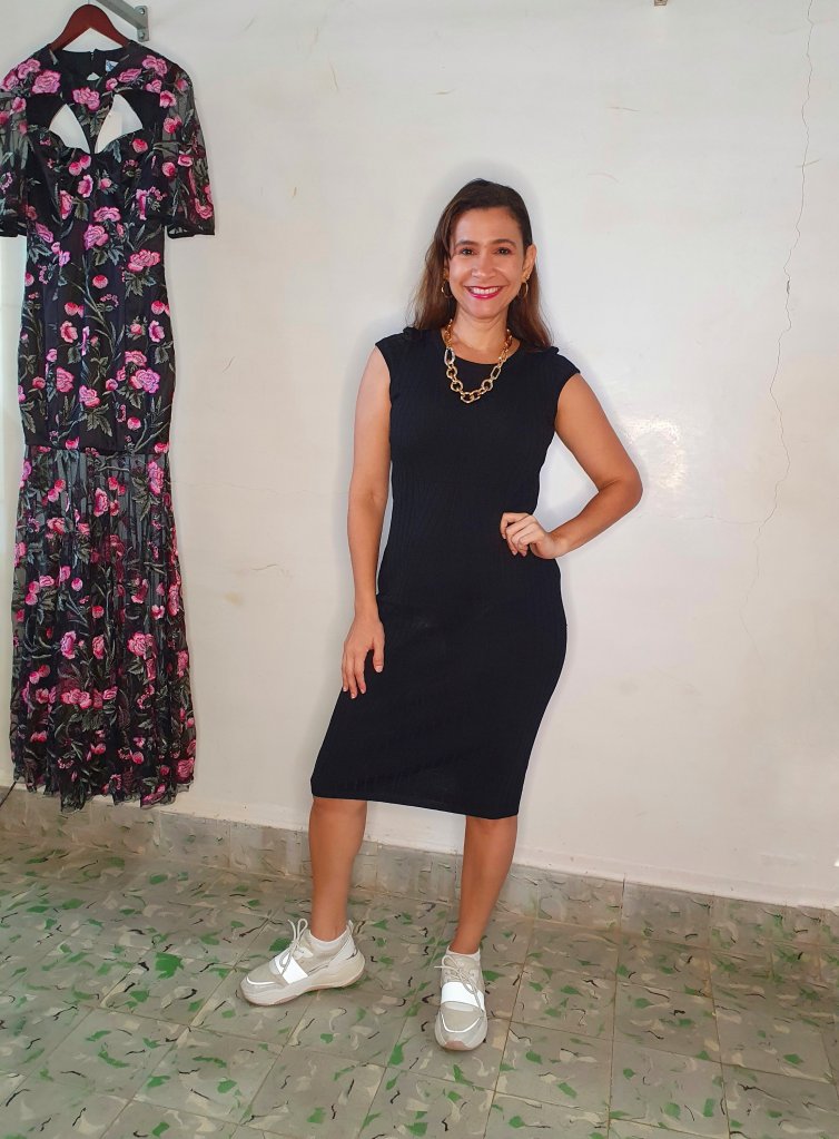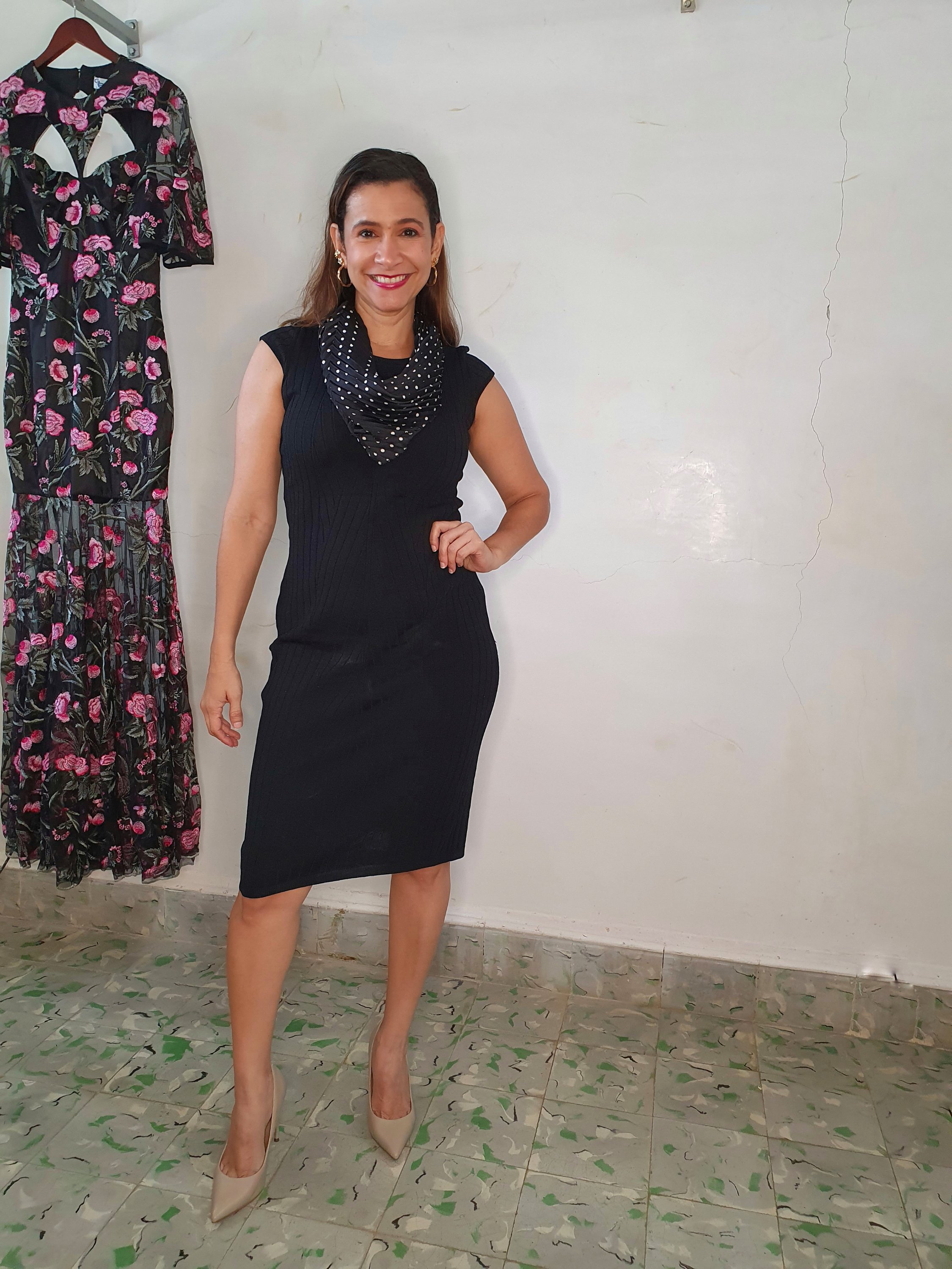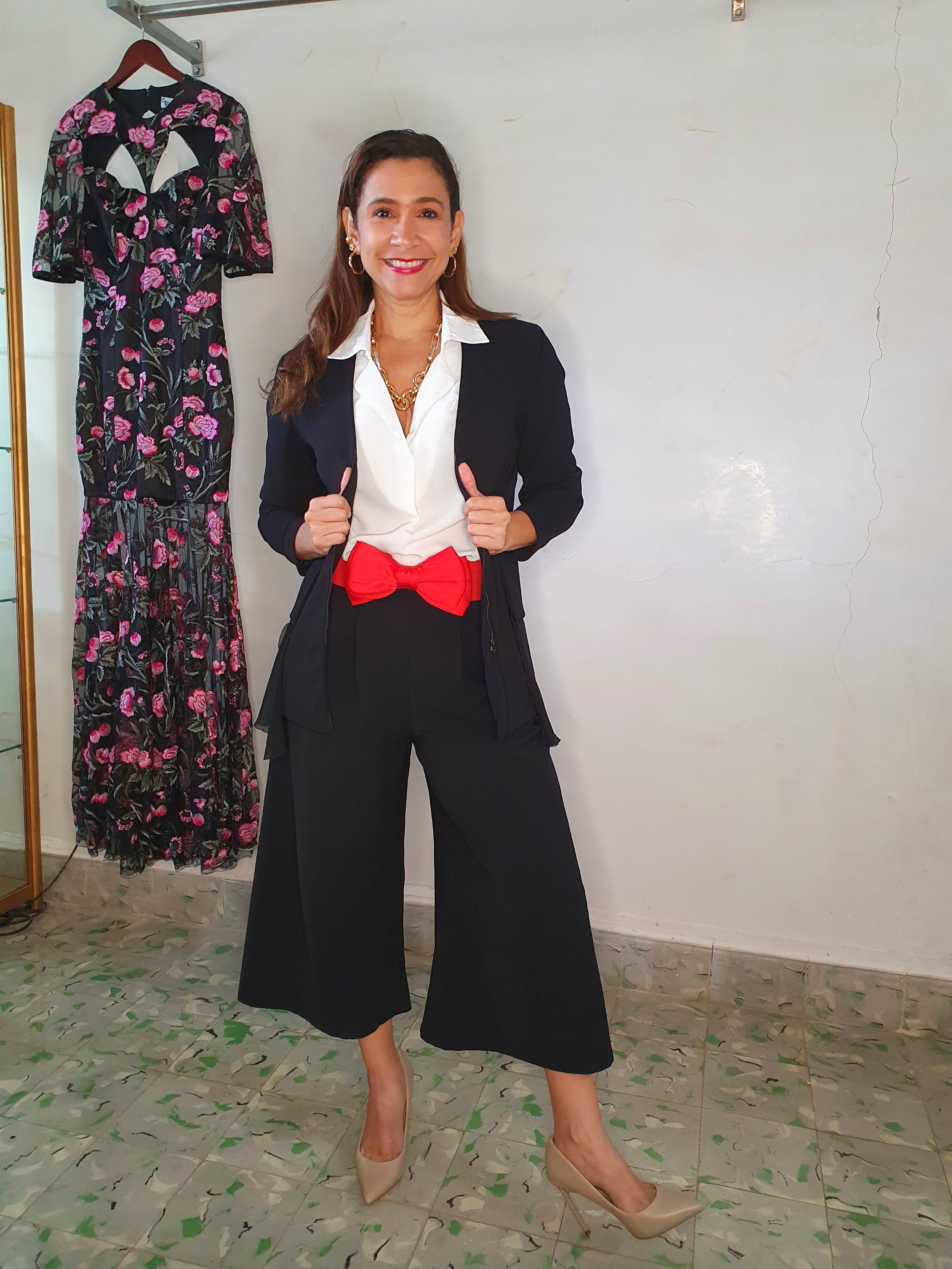 Mismo vestido, cambiando zapatos y agregando blazer negro, ya funciona para un look de trabajo.